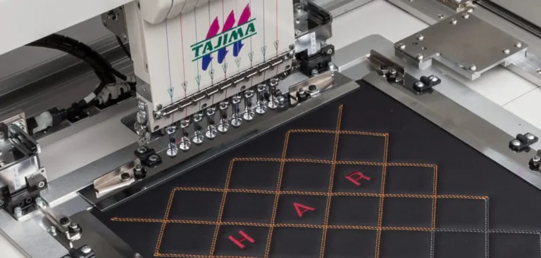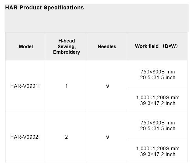 The “9 colors x 8 heads” system enables the simultaneous production of up to 8 products in a variety of styles. The sewing area is 1,000 mm (40 inches) (D) x 1,200 mm (48 inches) (W), making it possible to handle large products such as car seats and furniture, as well as a wide range of designs.