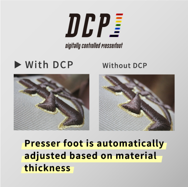 AI technology “i-TM” and Digitally Controlled Presser foot “DCP”. High quality, stable stitches with "i-TM" and "DCP"