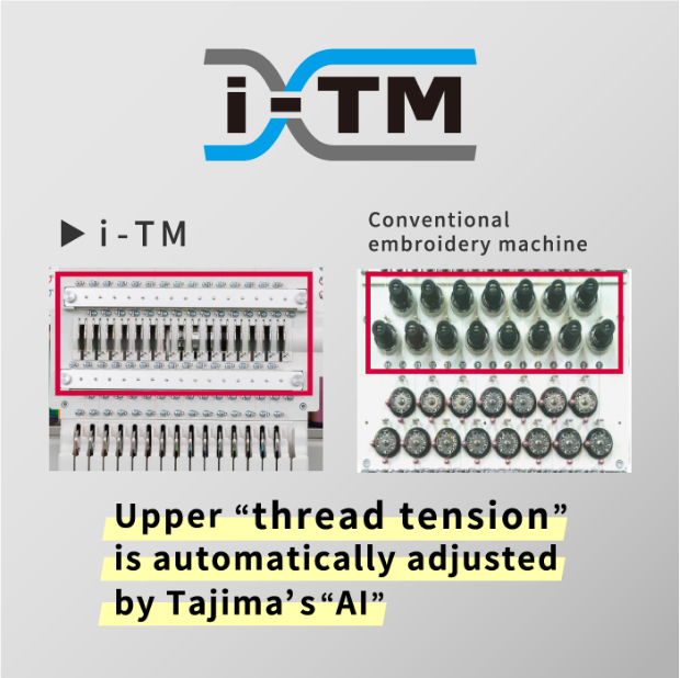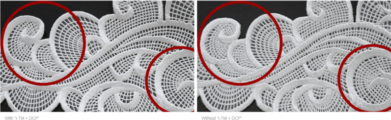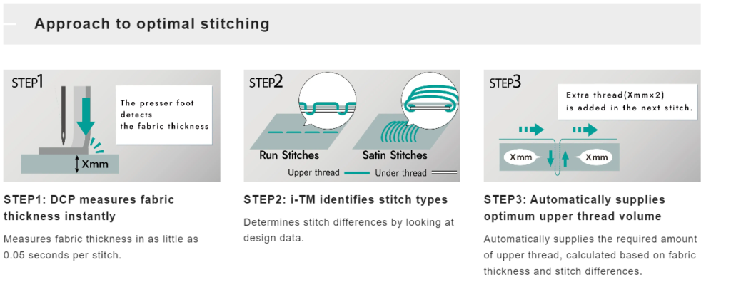 Intelligent Thread Management (i-TM) automatically calculates the upper thread supply by determining the fabric thickness and stitch type measured by DCP. There are no knobs to adjust the thread tension, as is the case with conventional embroidery machines. The Digitally Controlled Presser foot (DCP) measures the thickness of the fabric in as little as 0.05 seconds per stitch and applies the optimum pressing force to reduce fabric fluttering.