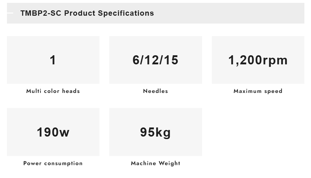 The TMBP2-SC standard single-head cylinder type embroidery machine with basic functions. It handles up to 15 colors and is suitable for name and emblem embroidery on uniforms, hats, socks, bags, etc., and for embroidery processing in stores. Despite its compact body, the machine is equipped with a maximum of 15 colors and a wide embroidery field of 360 mm (14.4inches) (D) x 500 mm (20 inches) (W) to meet a variety of needs.