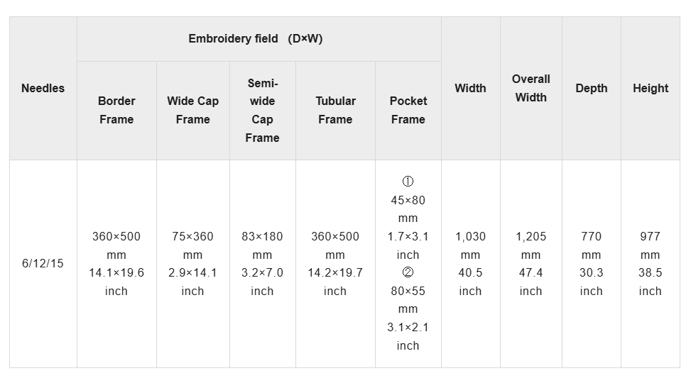 - The actual embroidery field and embroidery speed may vary depending on the items being produced, the machine model, and the embroidering conditions.