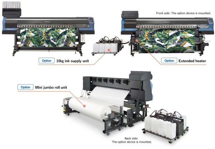 Mimaki TS55-1800 is the evolutional sublimation transfer inkjet printer for textile/apparel use, which achieved the high production ability with the maximum printing speed 135 sqm/h, the excellent functions and useful optional items ensuring the long-time continuous operation, and the reduction of running cost of manufacturing.